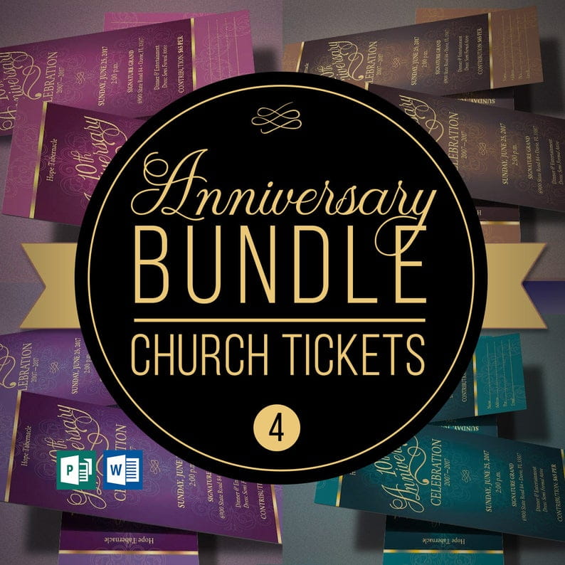 Church Anniversary Ticket Template Bundle – Word and Publisher, Size: 3″x7″, is for any anniversary event that needs an vintage theme. Great for Banquets, Galas, Luncheons and Tea Parties. Created with elegant colors and highlighted with gold. 4 Ticket Colors are included, Fuchsia, Gold, Purple and Teal.