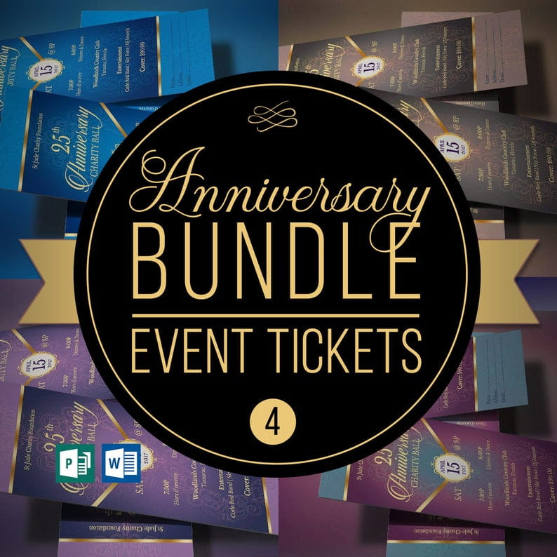 Anniversary Banquet Ticket Bundle – Word and Publisher, Size: 3″x7″, is for any anniversary event that needs an elegant theme. The gala ticket bundle included 4 different tickets created with an elegant background and highlighted with gold.