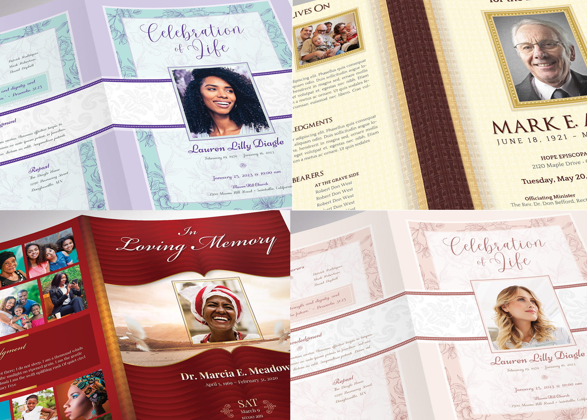 This list consists of 26 templates, some for males and others for females. They have an eye-catching vintage design with intricate gold accents, making them perfect for celebrating a life that has passed. The male templates feature beige, brown, blue, or deep maroon backgrounds with a placeholder for the deceased on the cover. The female template is done in shades of pink, red, orange, purple, cyan, or Halo Lilac. They have a placeholder for the deceased on the front.